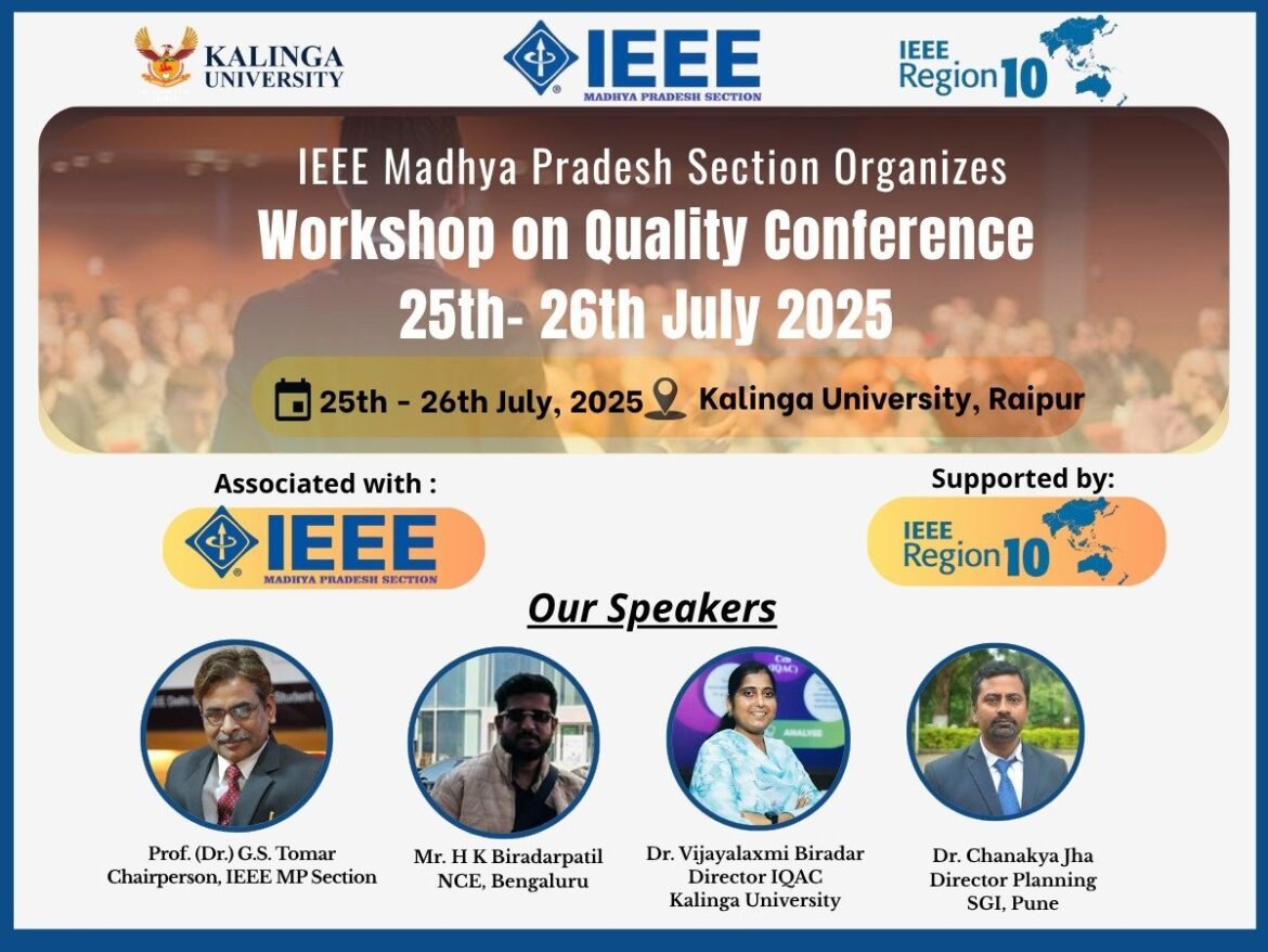 IEEE मध्यप्रदेश सेक्शन के तत्वावधान में तथा IEEE रीजन 10 के सहयोग से कलिंगा विश्वविद्यालय, नया रायपुर में 25 और 26 जुलाई, 2025 को “गुणवत्ता युक्त सम्मेलन” विषय पर दो दिवसीय कार्यशाला का आयोजन किया गया।