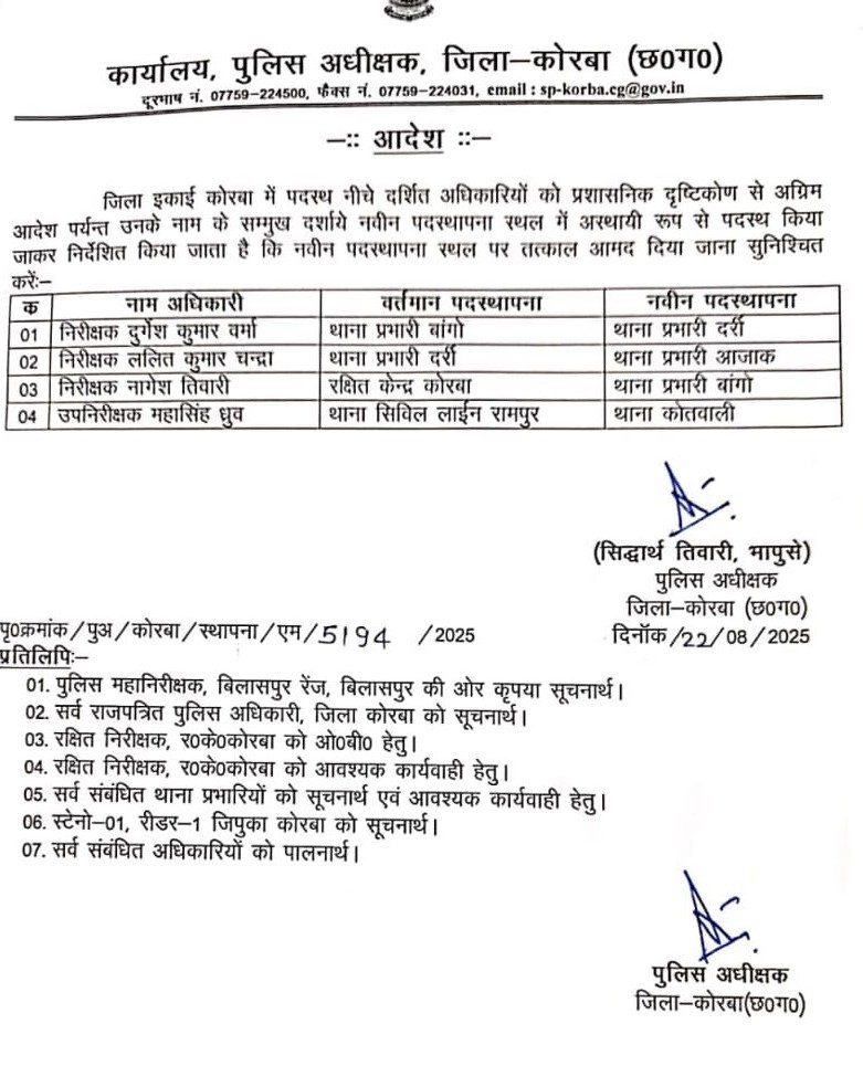 कोरबा ब्रेकिंग: TI और SI का तबादला, एसपी सिद्धार्थ तिवारी ने जारी किए आदेश